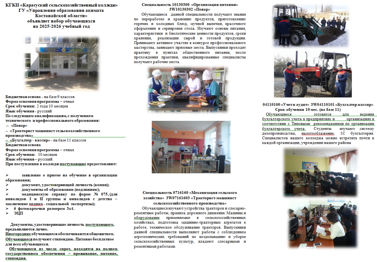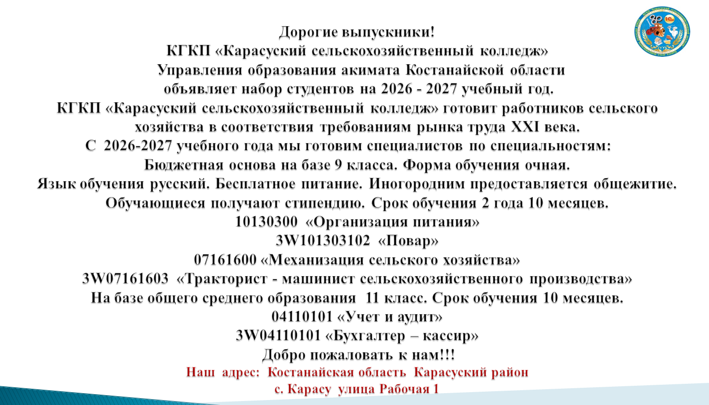 Уважаемые абитуриенты с 25.06.2025 г, начат прием документов на поступление в КГКП "Карасуский сельскохозяйственный колледж" УОАКО