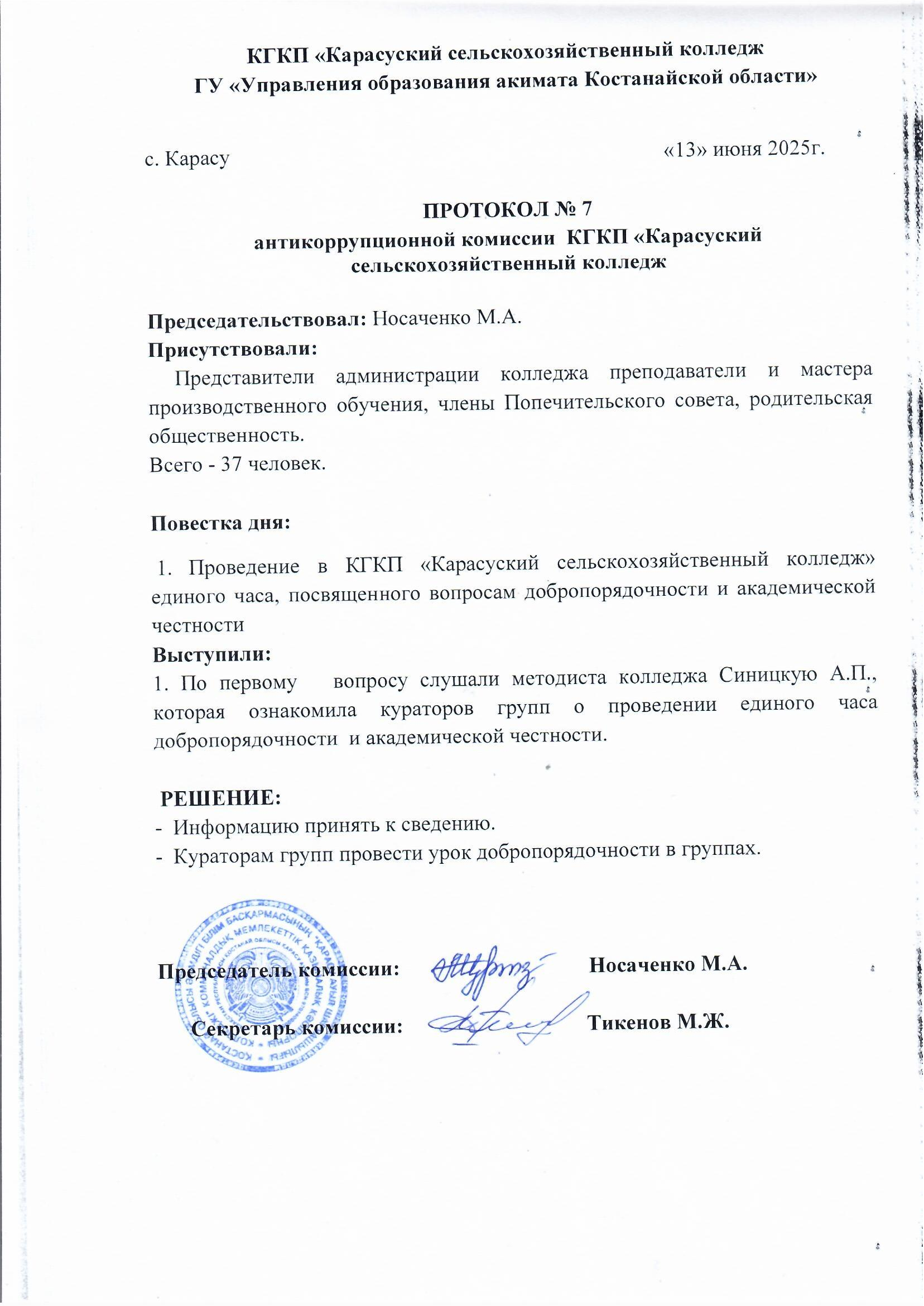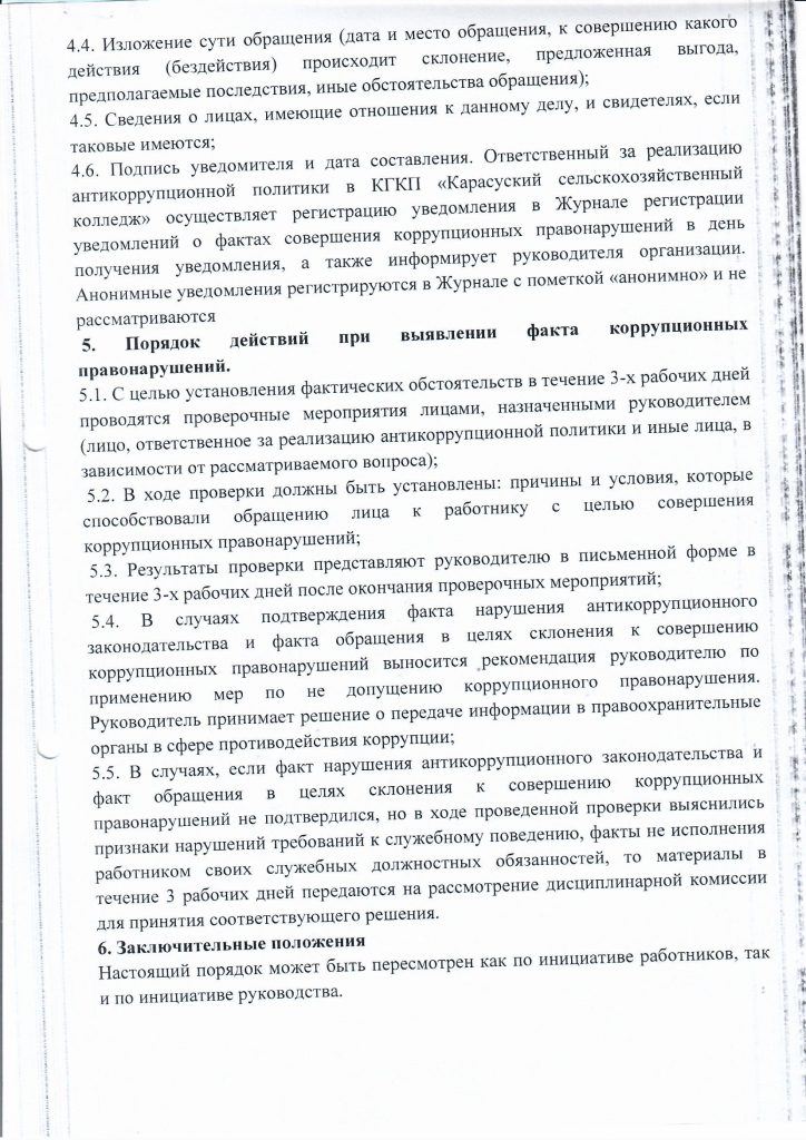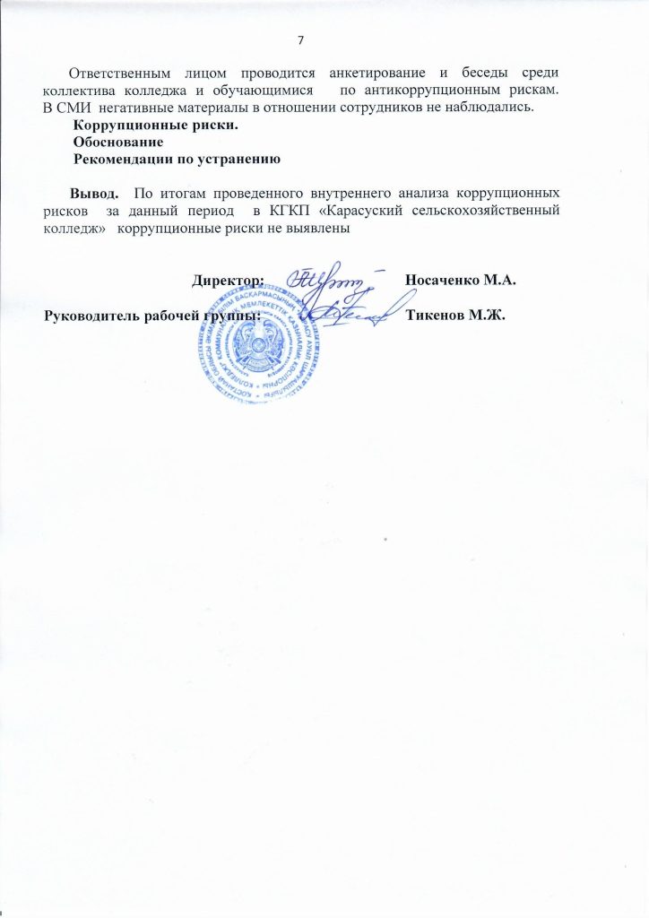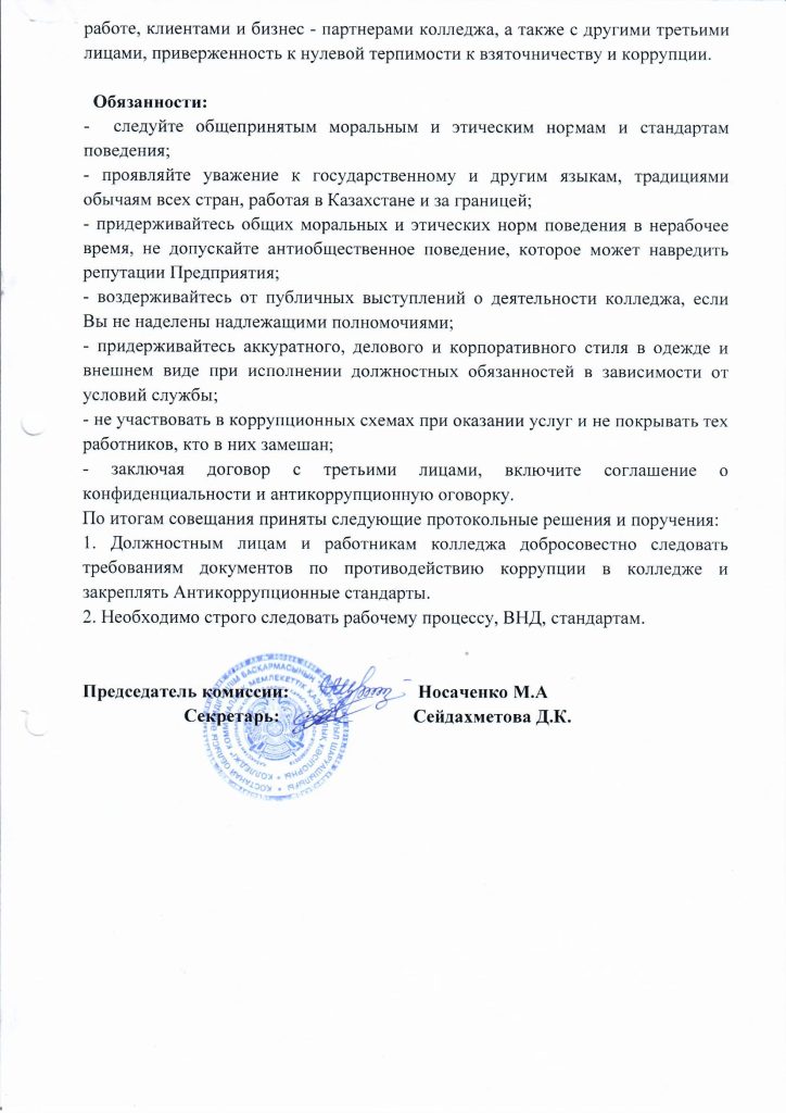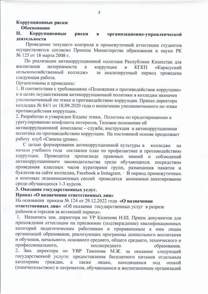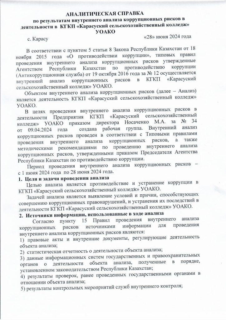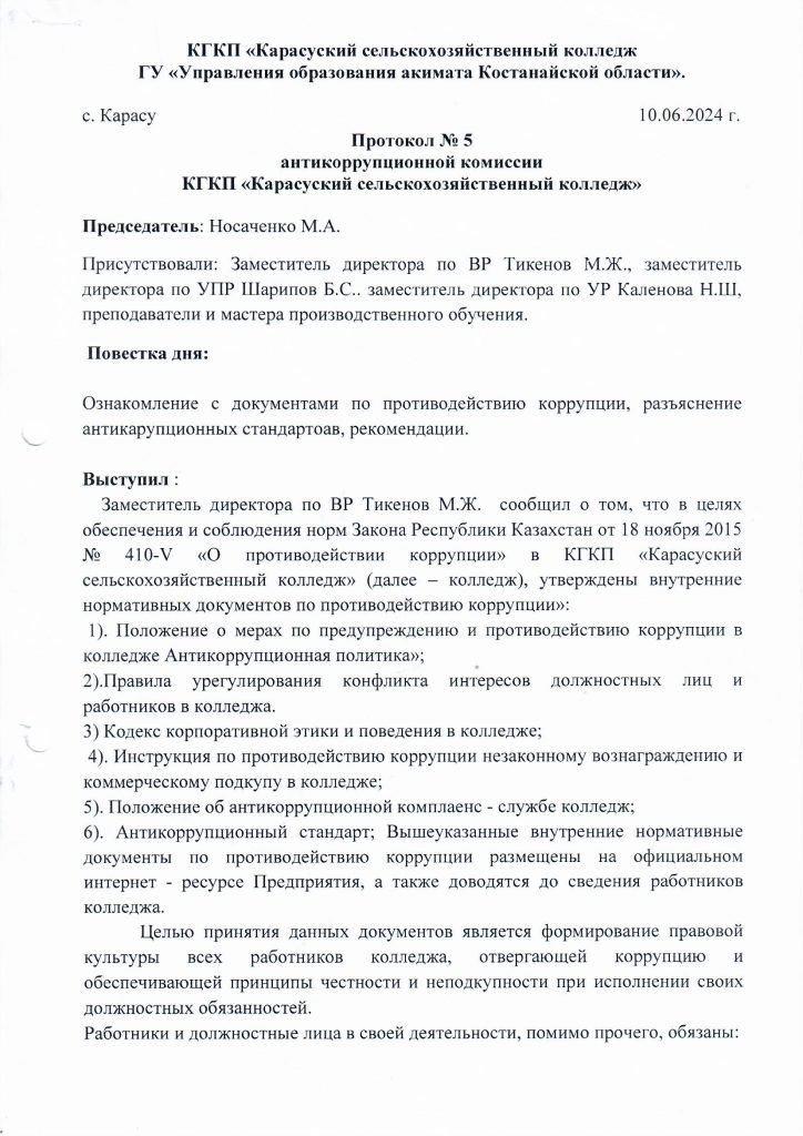 27 сентября 2024 года согласно плана мероприятий по противодействию коррупции в КГКП «Карасуский сельскохозяйственный колледж» уполномоченным по антикоррупционной службе заместителем директора по ВР Тикеновым М.Ж. была проведена беседа разьяснительного характера с кураторами учебных групп по антикоррупционным рискам, по формированию антикоррупционной культуры, по типовому положению об антикоррупционной комплаенс – службе, по порядку информирования сотрудников колледжа о фактах или возможных нарушениях антикоррупционного законодательства РК, а также по антикоррупционному стандарту и кодексу этики служебного поведения.