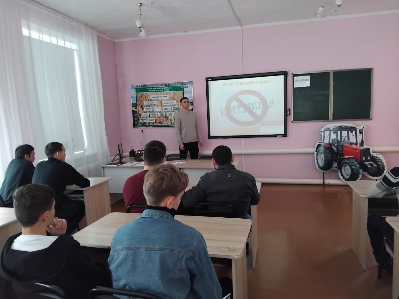 17 апреля 2025 года преподавателем истории КГКП «Карасуский сельскохозяйственный колледж» Сейдахметовой Д.К. проведена лекция с обучающимся группы ТМ-26/1 на тему: «Вербовка молодежи в различные организации». По окончании мероприятия обучающимся был продемонстрирован видеофильм.