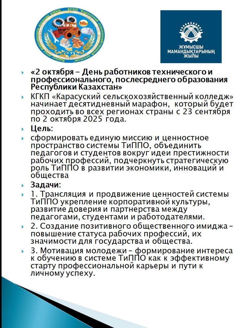 6 сентября 2025 года заместителем директора по воспитательной работе КГКП «Карасуский сельскохозяйственный колледж» Тикеновым М.Ж. был проведен семинар с кураторами учебных групп по единой программе воспитания «Адал азамат», направленная на воспитание сознательного, честного и ответственного гражданина.