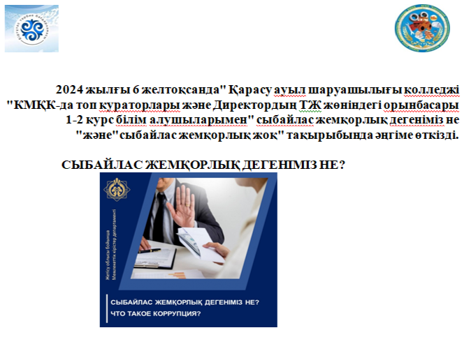 2025 жылдың 28 сәуірінде "Қарасу ауыл шаруашылығы колледжі" КМҚК-да нвитп педагог ұйымдастырушысы Р. Д. Елембаев 1 курс білім алушыларымен "Сыбайлас жемқорлыққа жол жоқ" тақырыбында құқықтық тәрбие бойынша әңгіме өткізді.