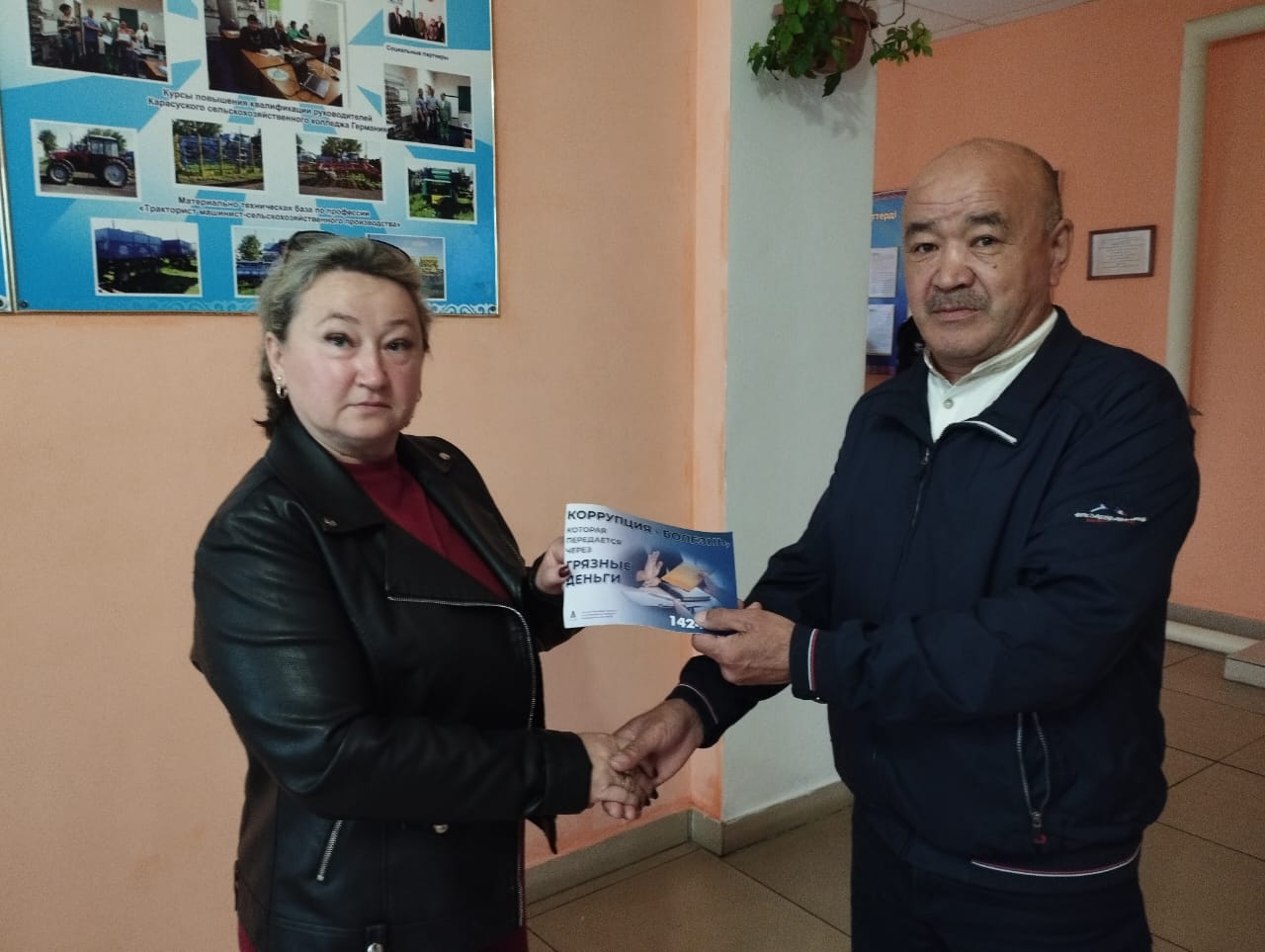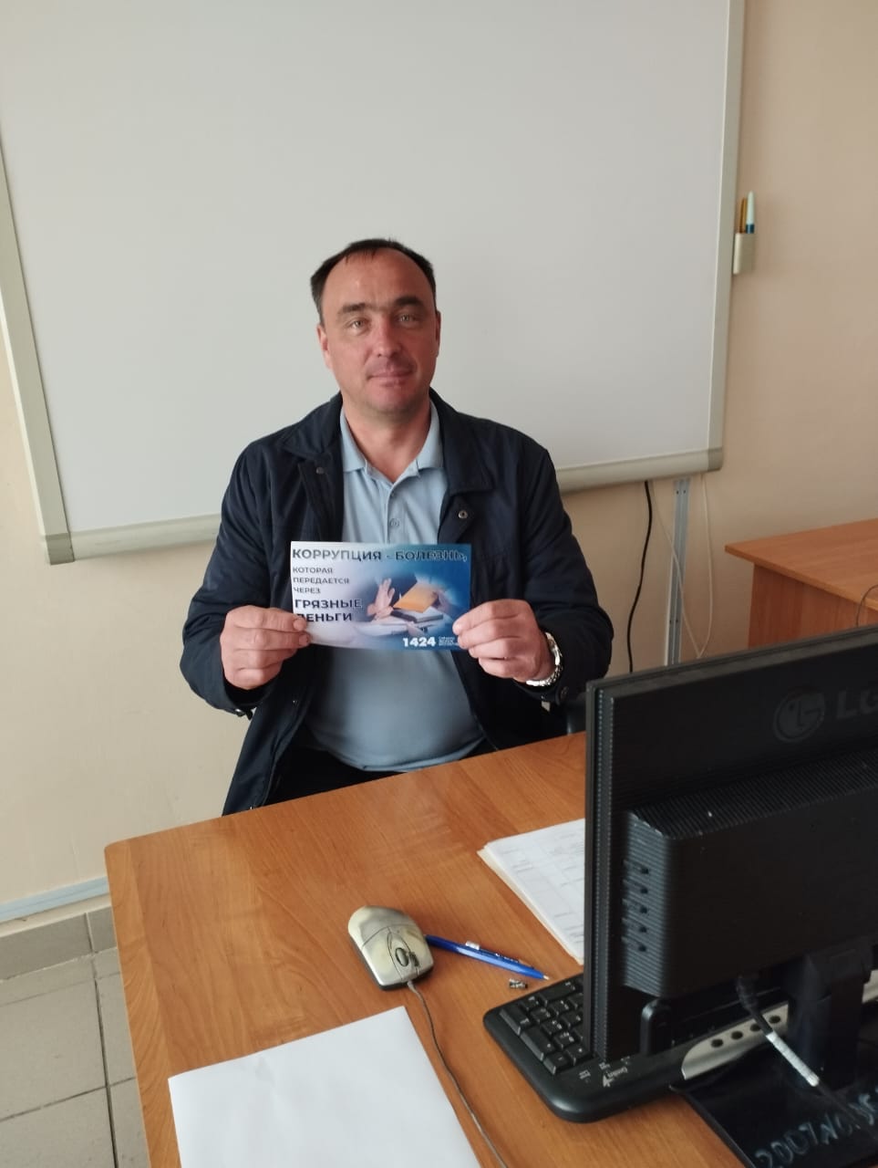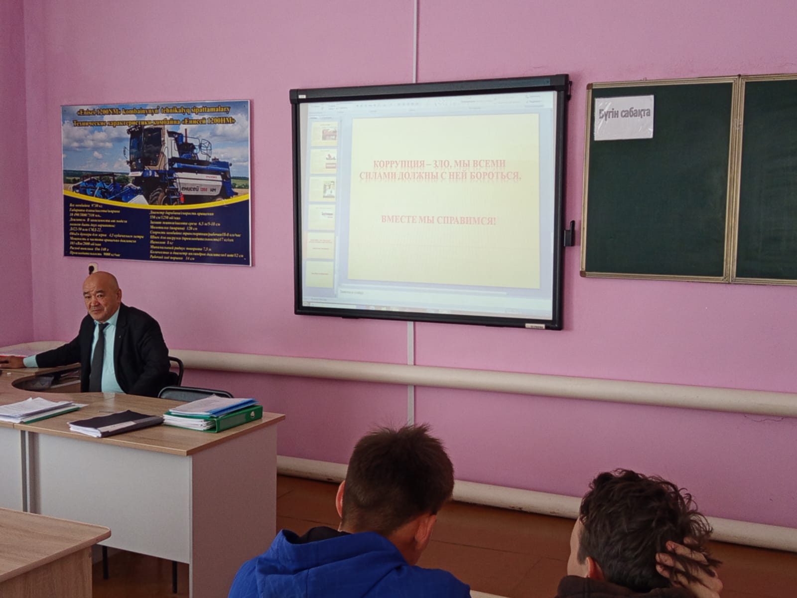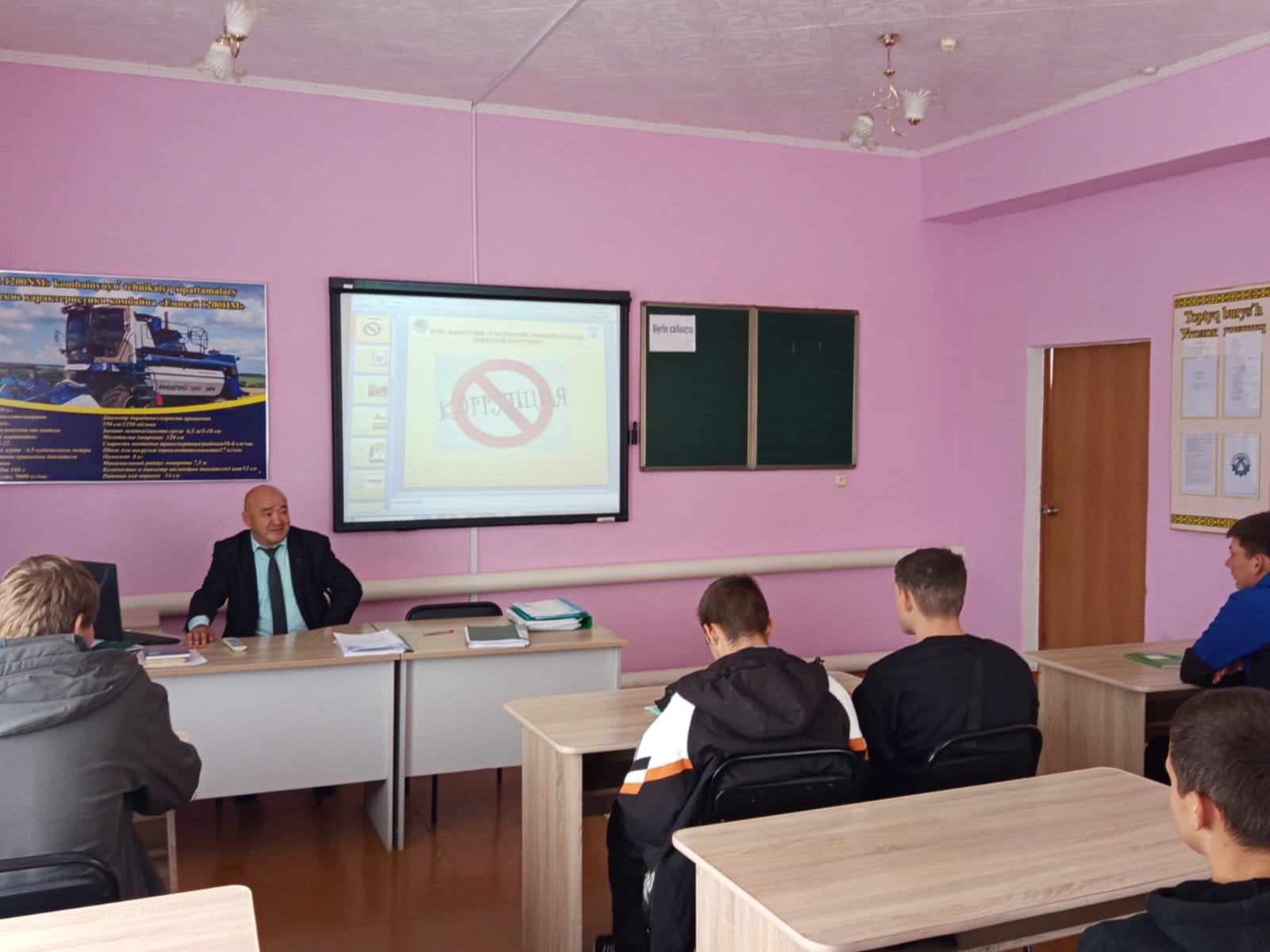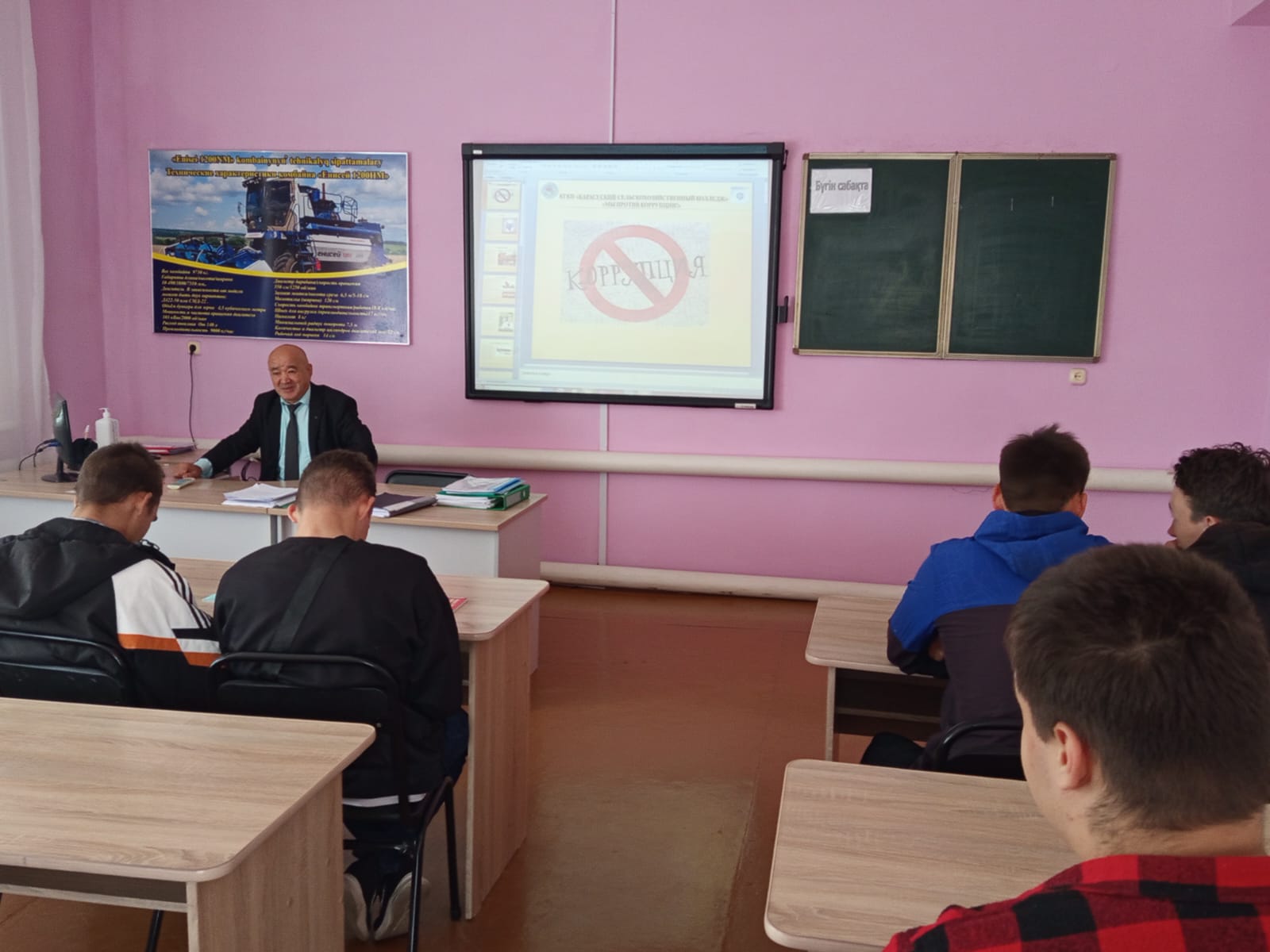 Топ кураторы в.п. Иванов «ауыл шаруашылығы өндірісінің тракторшы - машинисі» мамандығы бойынша ТМ - 23/2 тобының білім алушыларымен «Біз сыбайлас жемқорлыққа қарсымыз»тақырыбында сынып сағатын өткізді.