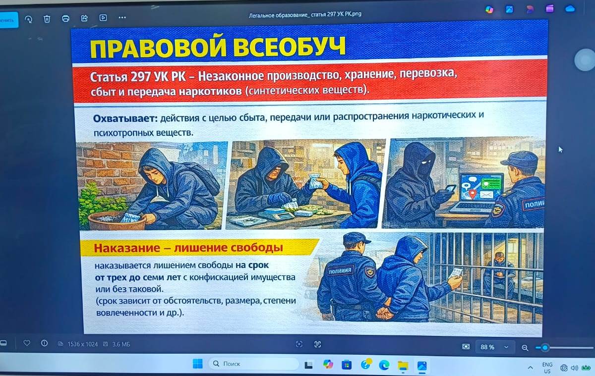 Дәріс барысында колледж білім алушыларына есірткіні тарату және өткізу үшін Қазақстан Республикасы Қылмыстық кодексінің 297 - бабы көзделгені туралы ақпарат жеткізілді. Жаза мерзімі ҚР ҚК 297 - бабы бойынша жекелеген бөліктерінде ашылған мән - жайларға байланысты.